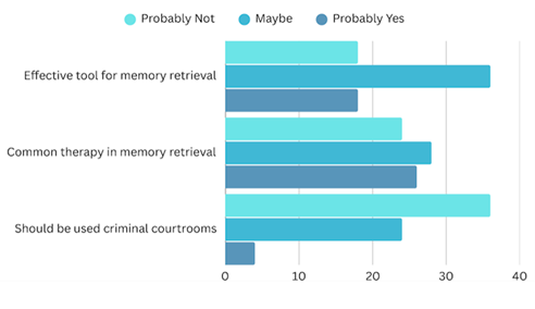 This survey asked participants a series of questions to determine how they thought of hypnosis and its trustworthiness in memory retrieval. Interestingly, the common attitude towards hypnosis reflected that of the national survey, with general doubt of the concept. One statement did stand out to me, which declared hypnosis as a reliable tool to be used in eyewitness testimony. Participants took a firmer stance than the national survey, stating that it should probably not be used in the criminal courts. Hopefully, this might suggest that hypnosis misconceptions might have a looser hold on this generation than past ones.